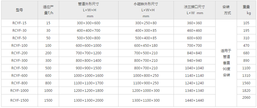 RCYF型垂直管道式永磁除鐵器適用于水泥、建材、化工、糧食、塑料、煤炭、耐火材料等行業(yè)的粉狀、顆粒狀、塊狀物料的除鐵,可與輸送管道連接,垂直安裝使用。