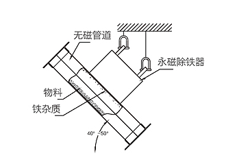 適合沒有輸送皮帶,只能提供下料溜槽的場合。當散狀物料經過時,鐵雜物被高磁場的永磁鐵吸附,處理鐵雜質時,打開管道專用門將雜質人工取除。該設備適用于含鐵量較少的場合,主要應用于水泥、化工、煤炭、塑料、耐火材料、建材等行業的下料管道中處理雜質。