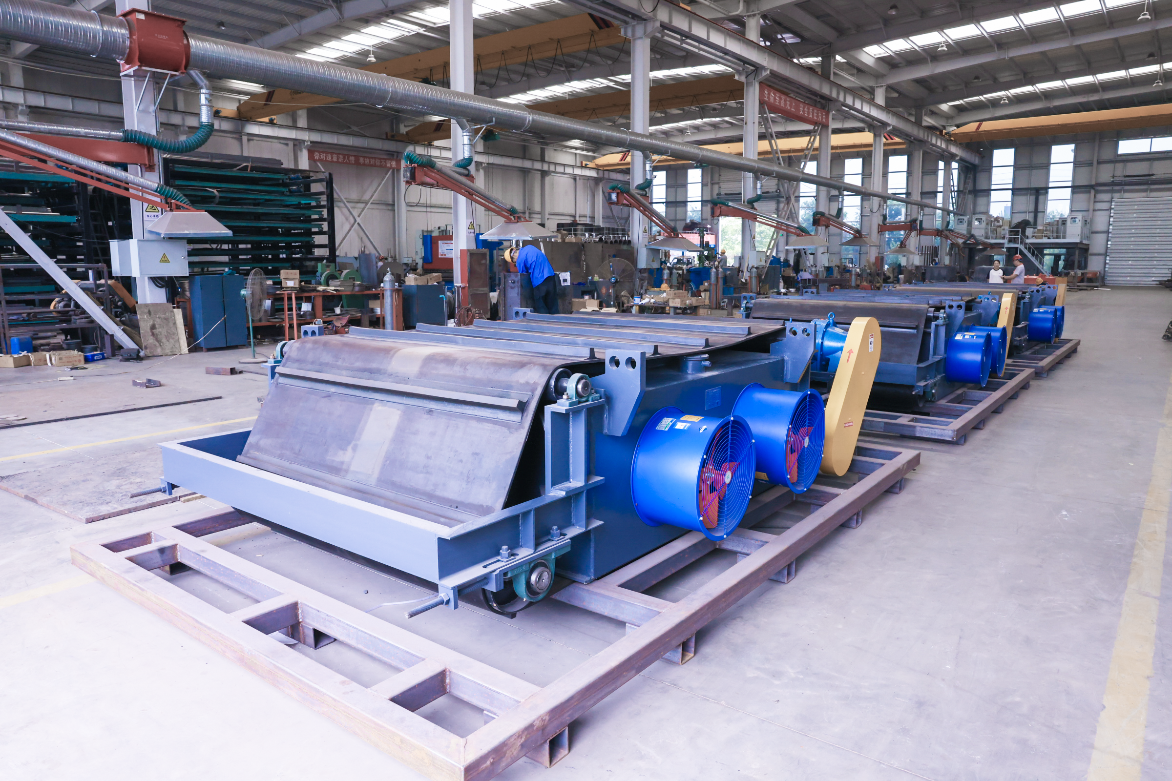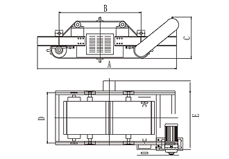RCDC型風冷自卸式電磁除鐵器,是在RCDA系列除鐵器的基礎上增加了驅動電機、滾筒、帶刮板的卸鐵膠帶等組成的卸鐵機構。在工作過程中卸鐵機構自動將卸鐵皮帶吸附的鐵磁性物質卸到集鐵箱內,無需停電人工清理,實現了除鐵自動化。