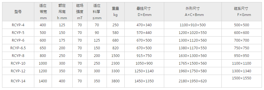 應用范圍: 輸料皮帶窄,物料薄,含雜鐵少的場合
