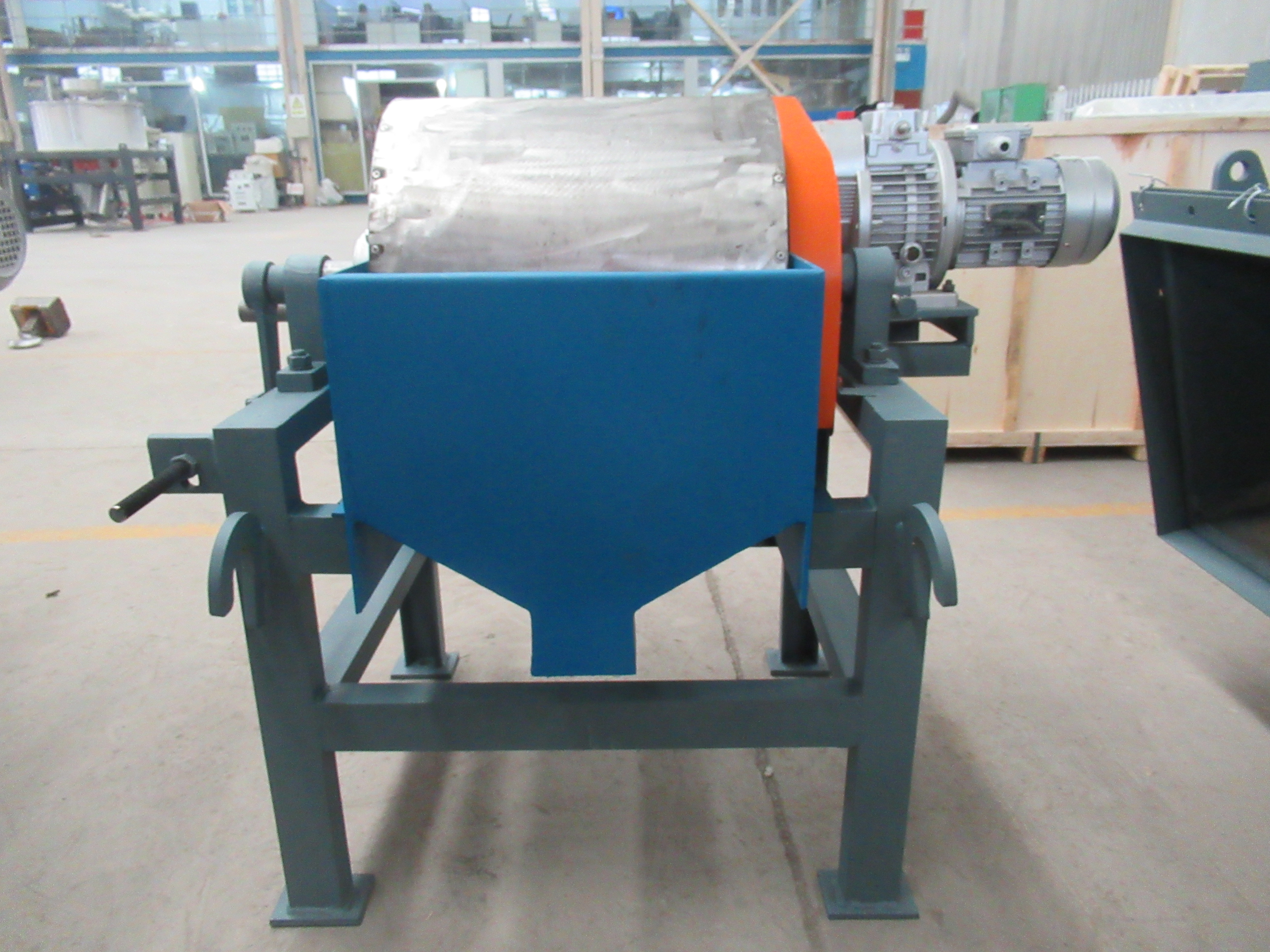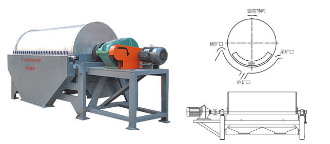 其原理是當(dāng)?shù)V漿進入磁場區(qū)時,其中強磁性礦物被吸附在圓筒表面,弱磁性和非磁性礦物被水流沖洗排出,而吸附在圓筒表面上的磁性礦物隨圓筒旋轉(zhuǎn),被帶出磁場區(qū),用沖洗水沖入精礦槽中,完成分選作業(yè)。