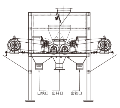 將物料均勻的送到磁選區(qū)域后,在設(shè)備的磁選區(qū)受到重力和磁場力的作用下,利用物料的磁性差異有不同的運(yùn)動軌跡實(shí)現(xiàn)分離,磁性礦物被吸附在磁輥表面旋轉(zhuǎn)到達(dá)精礦區(qū),毛刷將吸附在磁輥表面上的磁性礦刷脫。