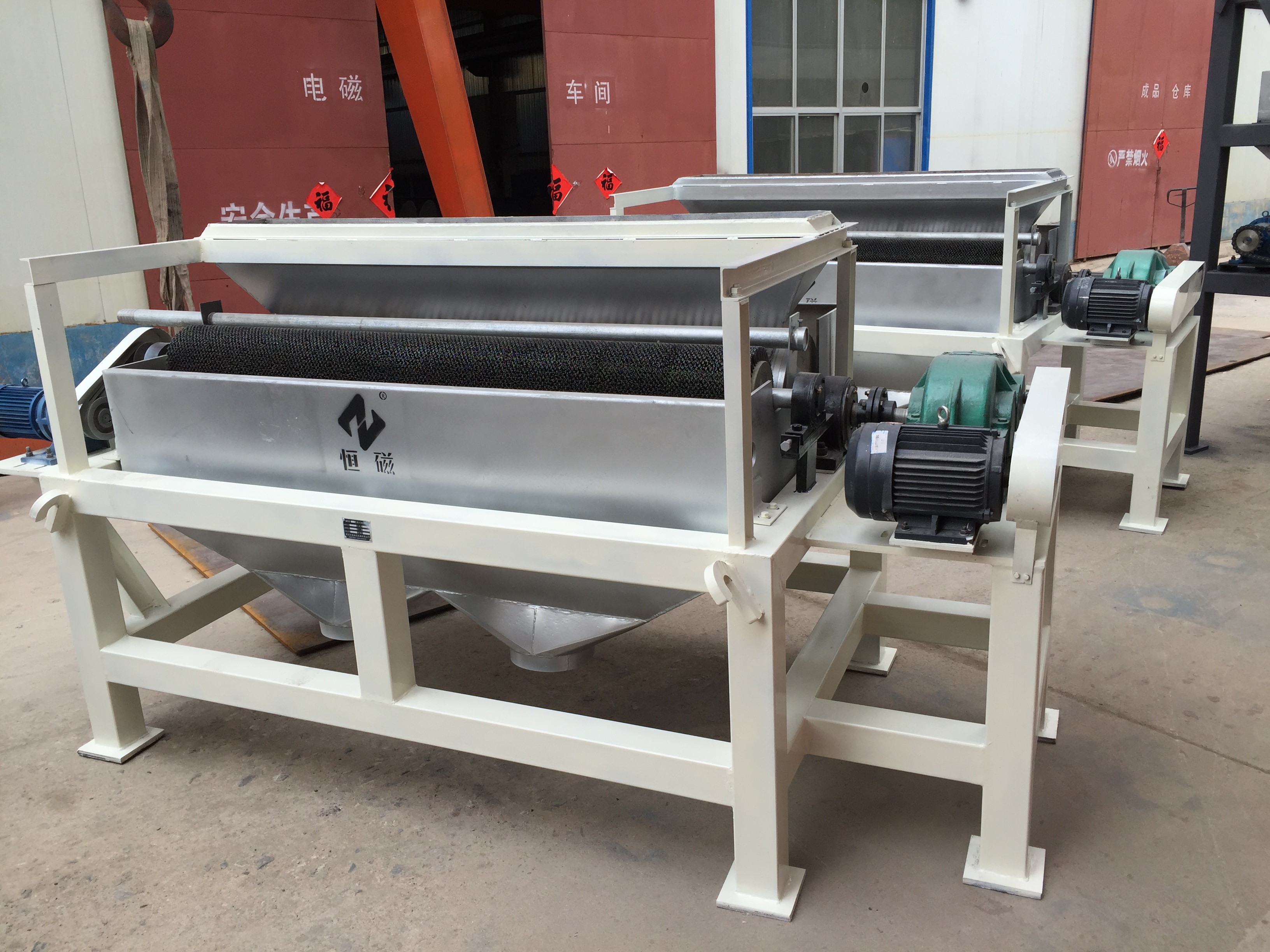 其原理為物料經料倉通過導料盤進入磁場區,磁性礦物被吸附在磁輥表面旋轉到達精礦區,毛刷將吸附在磁輥表面上的磁性礦刷脫,在高壓水的噴射下落到精礦斗里,部分未被吸附的磁性礦粒、非磁性礦粒和磁性較弱的礦粒進入到再選,個實現10輥組合,可對物料進行多達10次的分選,特別是對強磁性、中磁性、弱磁性共存礦物有顯著的分選效果。